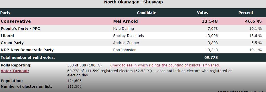 North Okanagan-Shuswap riding results, courtesy of Elections Canada