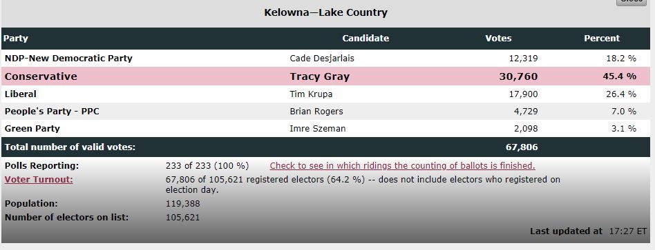 In the Kelowna-Lake Country riding, voter turnout was 64.2 per cent, with Conservative Tracy Gray defeating Liberal Tim Krupa by 12,860 votes, a second term for the former Kelowna city councillor.