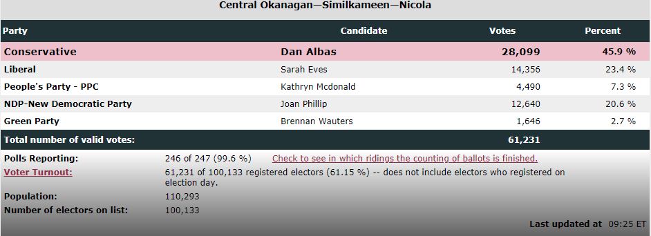 In Central Okanagan-Similkameen-Nicola, turnout was even lower at 61.1 per cent, with Conservative Dan Albas winning a fourth term by a 13,743 vote margin over Sarah Eves of the Liberals.