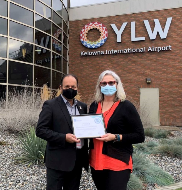 Sam Samaddar, Airport Director, and Lori Seeman, Airport Duty Manager, with ACI Airport Health Accreditation Certificate. (Submitted photo/City of Kelowna)In July 2020, YLW introduced increased health and safety measures to ensure the journey through YLW is safe for travellers. Some of the measures include: