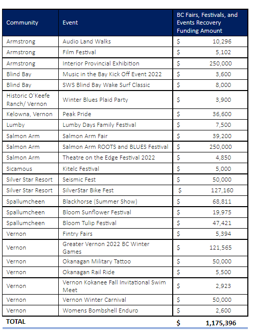 Twenty-four fairs, festivals, and events in the area will share in the recovery funding. That includes the Interior Provincial Exhibition and Salmon Arm ROOTS and BLUES Festival which both got $250,000, the Greater Vernon 2022 BC Winter Games, the Lumby Family Days Festival, the Okanagan Military Tattoo and the SilverStar Bike Fest.