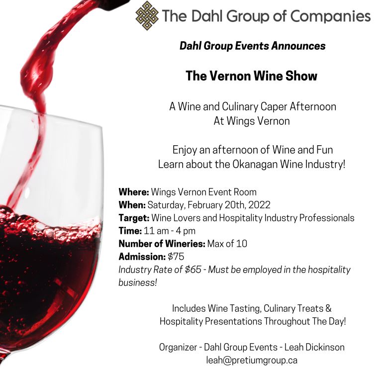 Wings Vernon, along with Dahl Group Events, is presenting the Vernon Wine Show Saturday, Feb. 20 from 11 a.m. to 4 p.m.