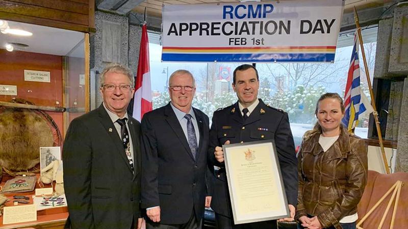 L-R: MP Mel Arnold, MLA Eric Foster, RCMP Insp. Kevin Keane and Vernon councillor Kari Gares as RCMP Day on Feb. 1 is proclaimed at the Greater Vernon Museum in December, 2019. (Pete McIntyre/Vernon Matters file photo)“Their efforts and committment to the safety and security of all Canadians are part of the fabric of the nation,” said a statement from the B.C. government.