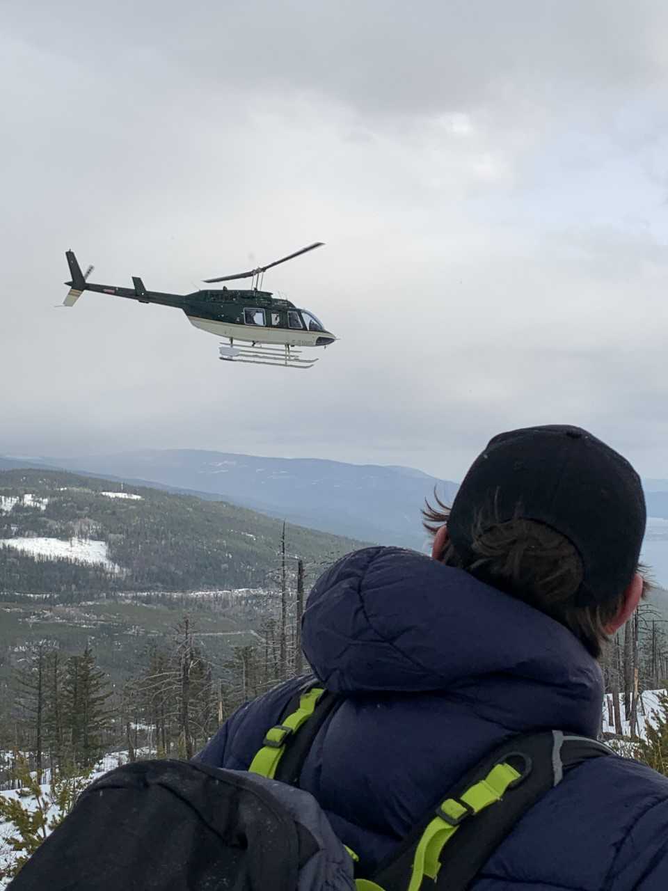 A hiker looks on as a helicopter takes his friends back to Bertram Creek Park. (Photo credit: COSAR)Two hours later, COSAR was called out to rescue four hikers in Okanagan Mountain Park.