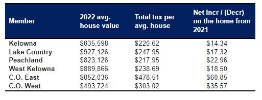 The tax impacts for general RDCO services on the average home in each specific area are shown in the following table. The actual tax rate varies from neighbourhood to neighbourhood and by municipality, depending on the level of funding participation and local services provided by the regional district.