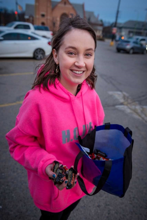 Since September 2019, she has spent as many as four evenings each week volunteering with HOPE. She dons her bright, pink hoodie, then heads downtown to meet other volunteers and together they hand out goods to people experiencing homelessness. These items include water, food, warm clothing, harm reduction supplies, and just about anything else someone might need. The volunteers also take requests for items to bring with them next time.