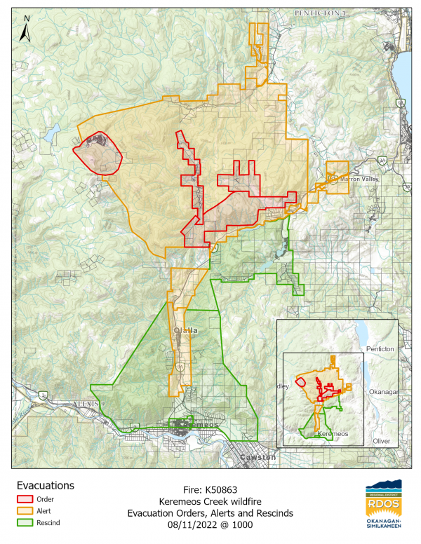 RDOS EOC Evacuation Orders and Alerts map. (image courtesy of the Regional District of Okanagan Similkameen)Evacuation alerts have been rescinded for the Village of Keremeos and rural Keremeos in Electoral Area G.