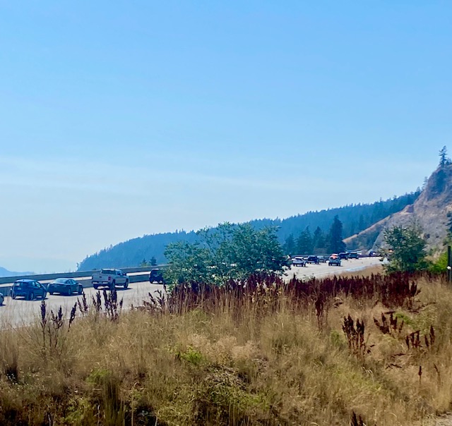 RV fire on Highway 97 caused traffic slowdowns in Oyama area. (Helen Bennett/Vernon Matters photo)