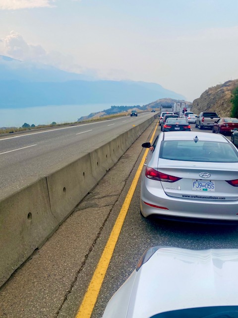 Traffic stalled in south bound lanes of Highway 97 south of Vernon Tuesday morning. (Helen Bennett/Vernon Matters photo)