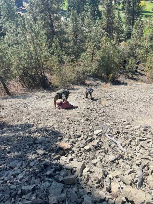 The Kelowna Fire Department and Emergency Health Services also attended the scene and located the woman about three quarters down the steep mountainside under a tree.