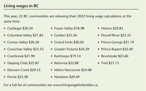 The organizations note what they call a “strikingly large gap” between the 2022 living wages for communities across BC and the province’s minimum wage (currently $15.65 per hour).
