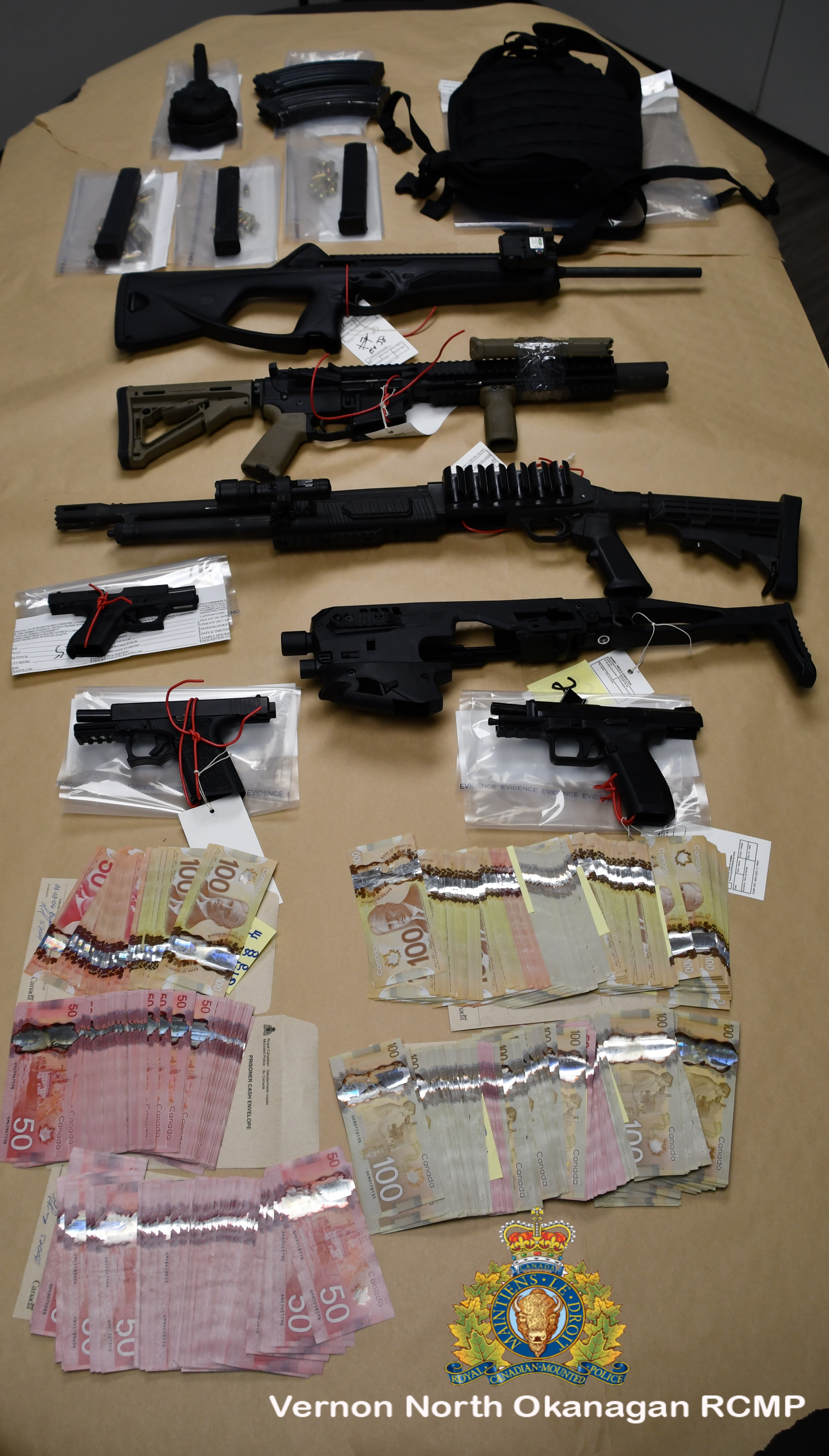 Guns and cash seized from three homes and storage locker. (submitted photo/RCMP)The search warrants were executed at residences on Belaire Drive in Armstrong, Stillwater Court in Lake Country, Majoros Road in West Kelowna and a storage locker in West Kelowna.
