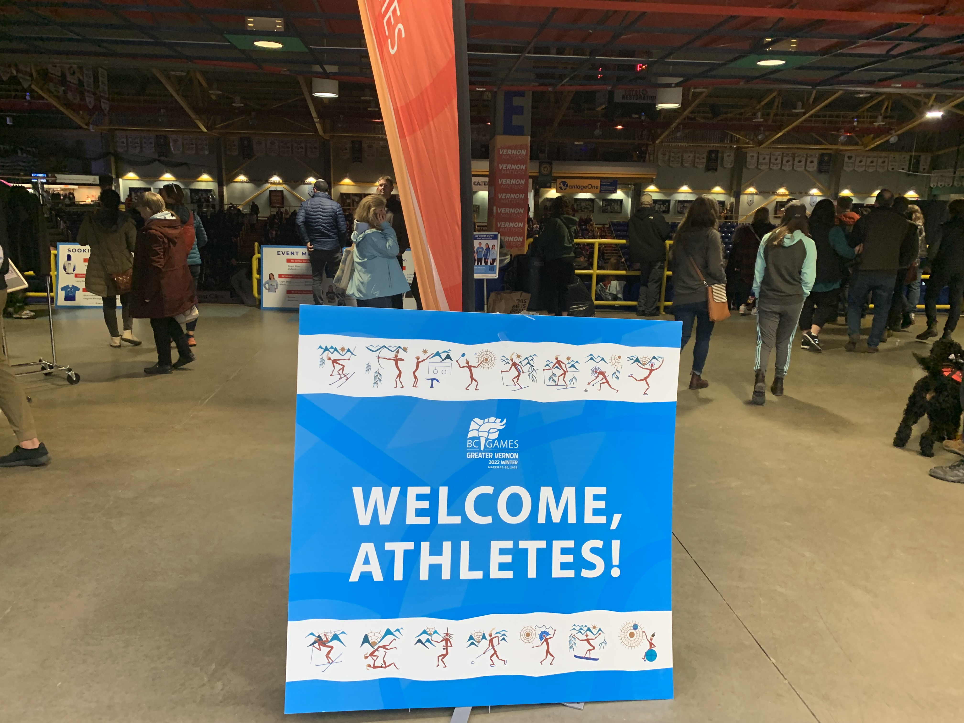 The welcome sign at the 2022 Greater Vernon B.C. Winter Games opening ceremony inside Kal Tire Place (Photo by Liam Verster / Vernon Matters)The ceremony saw the athletes, coaches and officials file into the stadium, which was filled with over 1,000 people from across the province.