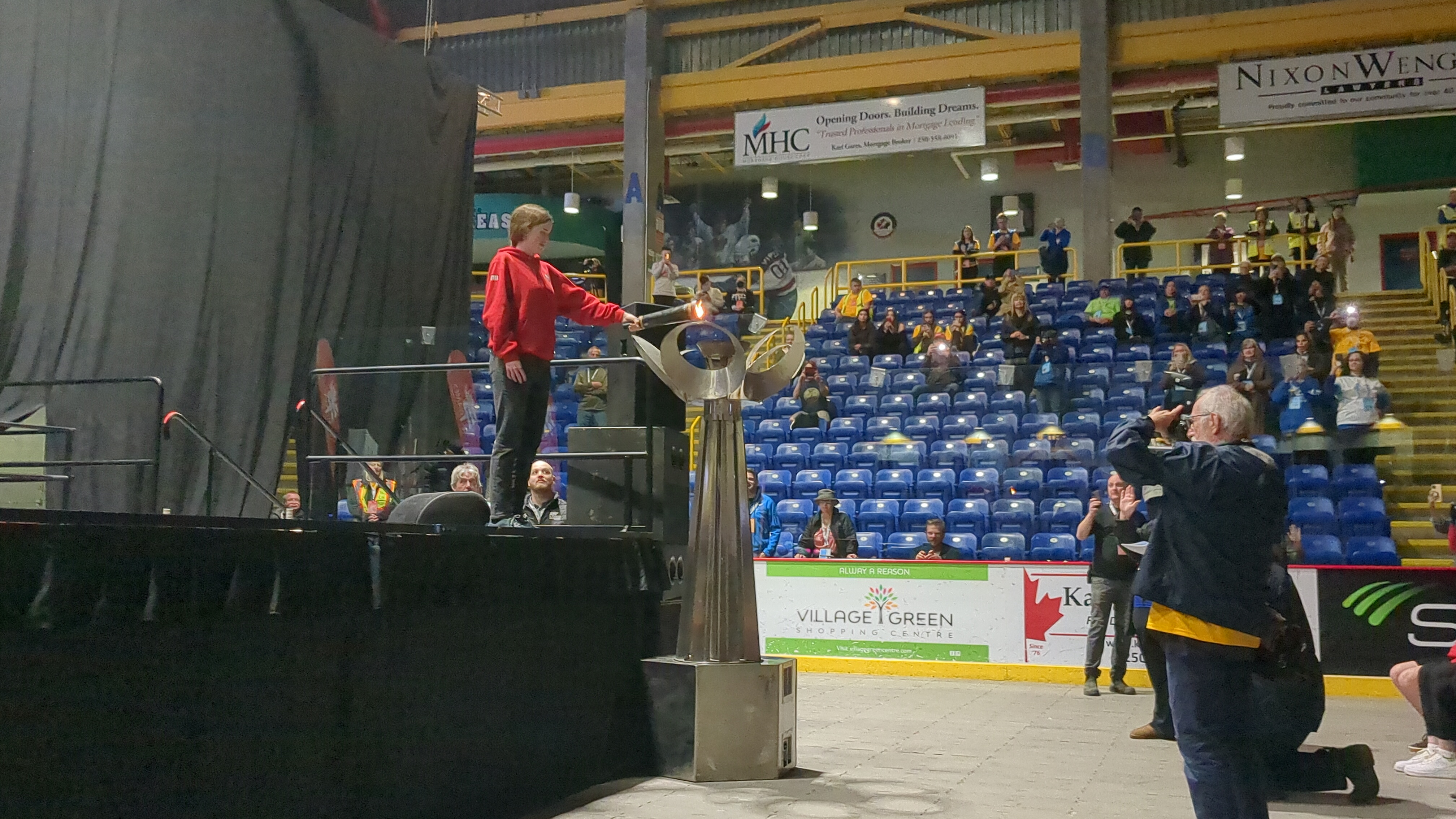 Biathlete Sierra Munroe started with the flame, handing it off to alpine skier Olivia Lahey and finally to judo athlete Jordyn McRory who lit the cauldron at Kal Tire Place.