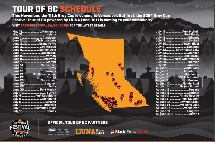 “For die-hard football fans and entertainment seekers alike, the Tour of BC, powered by LiUNA Local 1611, is your opportunity to leave a mark on the 2024 Grey Cup Festival,” a promotion for the event stated.