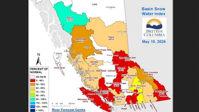 The latest snowpack readings for B.C. show the province’s average is at 57 per cent of normal. The Okanagan is at 49 per cent of normal, down from 60 per cent at the start of May. BC River Forec...